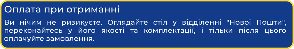 Ви нічим не ризикуєте. Оглядайте стіл у відділенні "Нової Пошти", переконайтесь у його якості та комплектації, і тільки після цього оплачуйте замовлення.