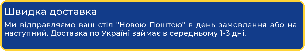 Ми відправляємо ваш стіл "Новою Поштою" в день замовлення або на наступний. Доставка по Україні займає в середньому 1-3 дні.