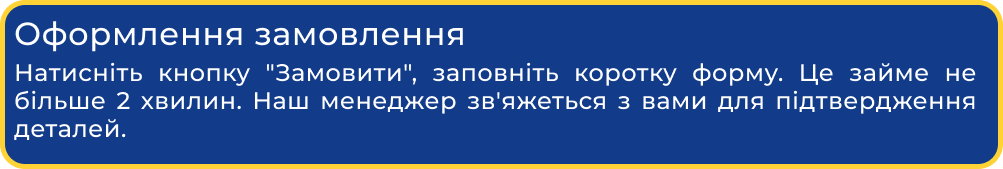 Натисніть кнопку "Замовити", заповніть коротку форму. Це займе не більше 2 хвилин. Наш менеджер зв'яжеться з вами для підтвердження деталей.